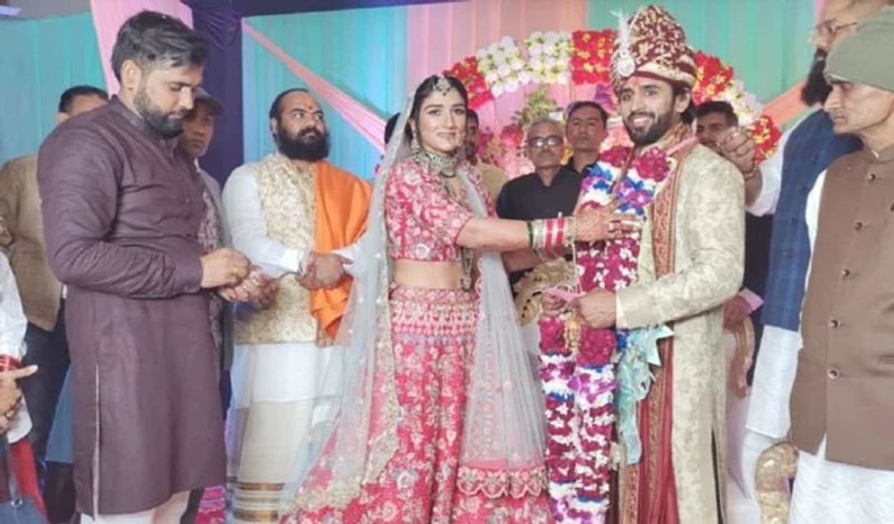 जयमाला के दौरान नवदंपति की तस्वीर। लाल रंग के लहंगे में संगीता फोगट बेहद खूबसूरत दिखी। वहीं दूल्हे बजरंग पुनिया भी शेरवानी में जंच रहे थे।