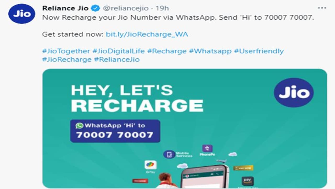 हाल ही में टेलीकॉम कंपनी जियो ने अपने आधिकारिक ट्विटर हैंडल पर एक पोस्ट कर जानकार दी, कि अब आप व्हाट्सएप के जरिए अपना जियो नंबर रिचार्ज कर सकते हैं।