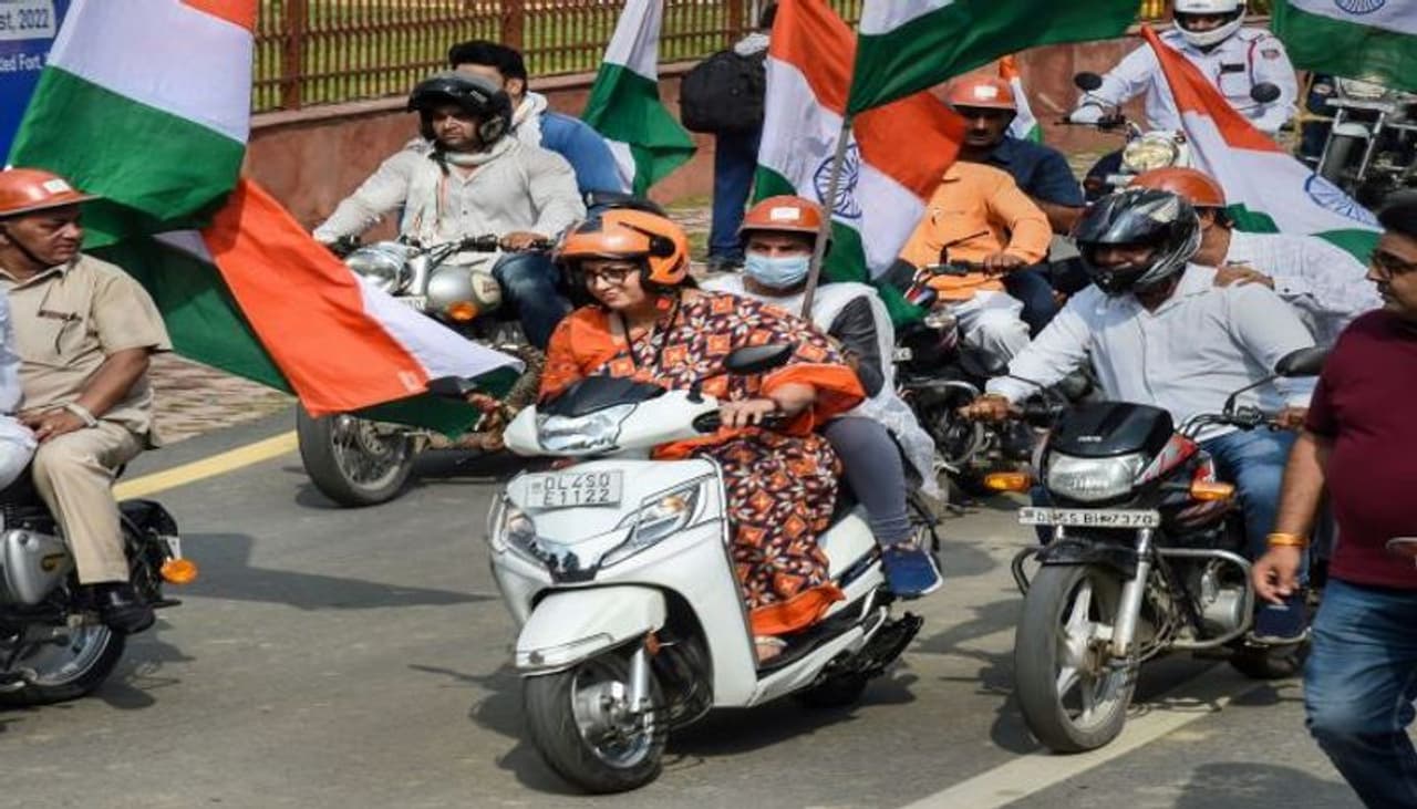 रेल राज्य मंत्री दर्शना जरदोश और भाजपा नेता राज्यवर्धन सिंह राठौर तथा सतीश कुमार ने तिरंगा बाइक रैली में हिस्सा लिया।