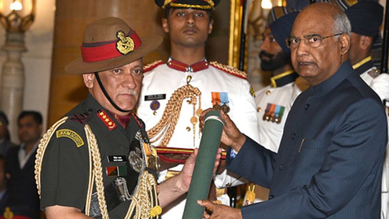 राष्ट्रपति राम नाथ कोविंद ने 14 मार्च 2019 को राष्ट्रपति भवन में रक्षा अलंकरण समारोह के दौरान सेना प्रमुख जनरल बिपिन रावत को परम विशिष्ट सेवा पदक देते हुए।