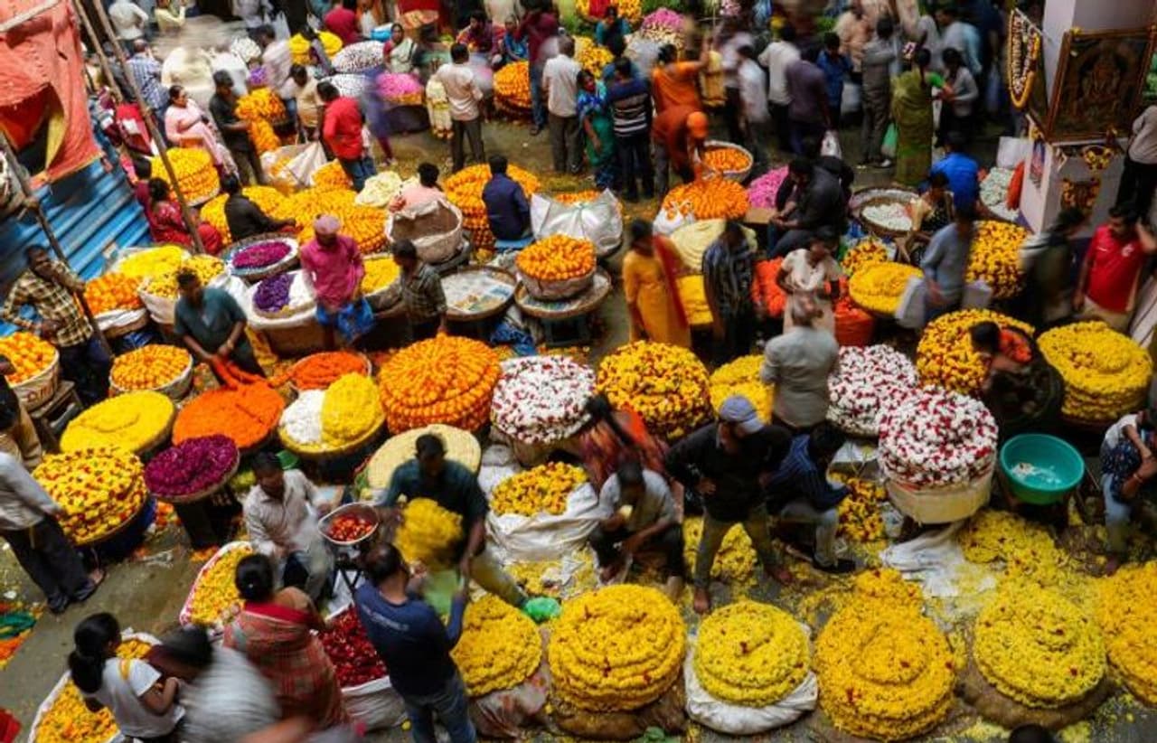 यह तस्वीर कर्नाटक की राजधानी बेंगलुरु के फूल मंडी की है, जहां दीपावली पर्व के लिए थोक में माला-फूल खरीदने वालों की भीड़ जुटी है।