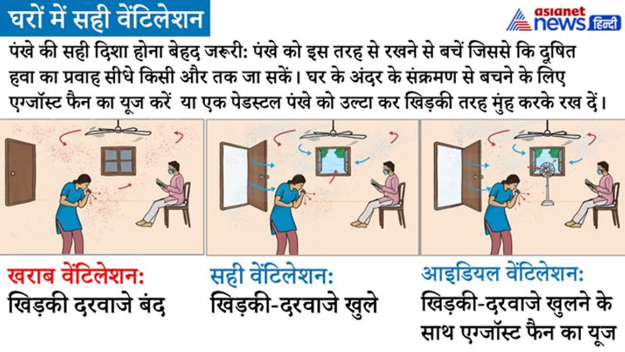घरों में सही वेंटिलेशन : पंखे को इस तरह से रखने से बचें जिससे कि दूषित हवा का प्रवाह सीधे किसी और तक जा सकें। घर के अंदर के संक्रमण से बचने के लिए एग्जॉस्ट फैन का यूज करें या एक पेडस्टल पंखे को उल्टा कर खिड़की तरह मुंह करके रख दें।
