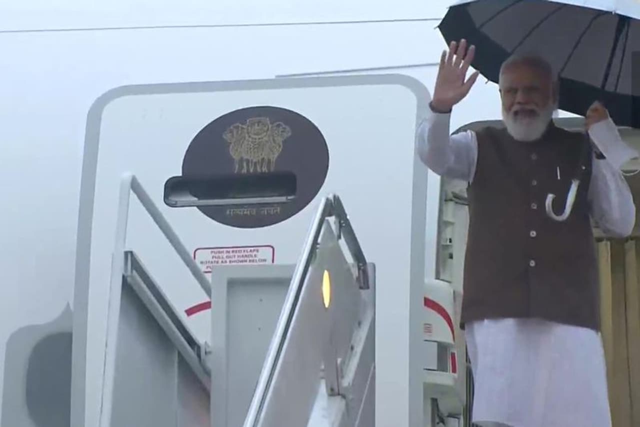 खुद छाता लेकर फ्लाइट से उतरे पीएम, एयरपोर्ट पर लहराया तिरंगा, मोदी जिंदाबाद के लगे नारे