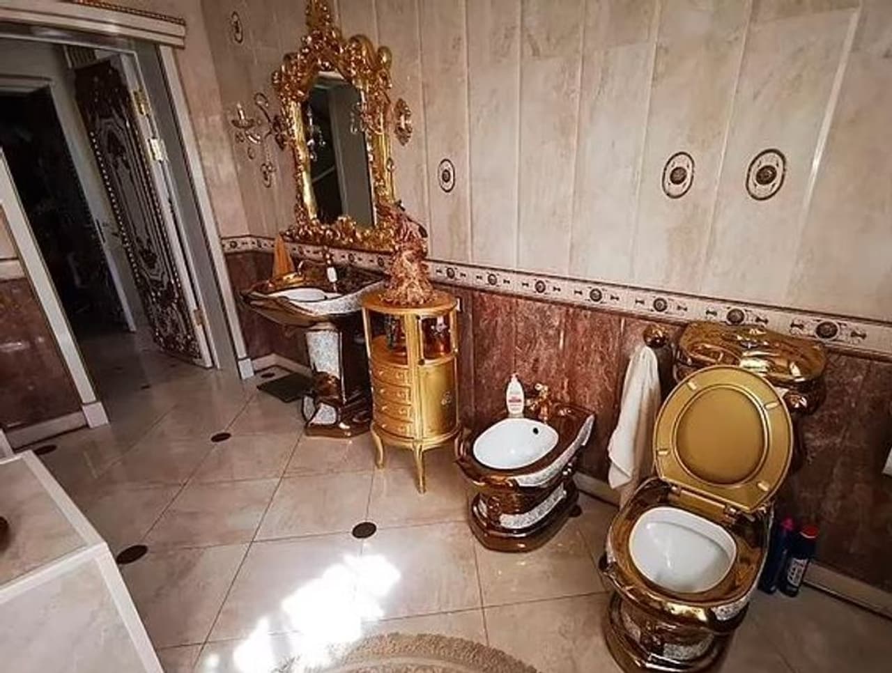 फोटो में दिख रहा है कि फर्श और दीवारों में संगमरमर लगाया गया है। बाथरूम को गोल्डन कलर से रंगा गया है। एक दूसरे बाथरूम में एक डबल-एंड बाथटब है, उसका सिंक और एक सोने का पेंट वाला शॉवर क्यूबिकल है। एक झूमर छत से लटका हुआ है।