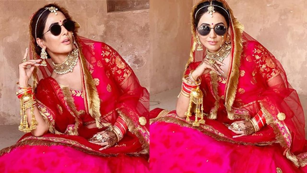 हिना ने जो फोटोज शेयर की है उसमें वे लाल लहंगा, मांग टीका, हैवी नेकलेस और गॉगल में नजर आ रही है। ये फोटोज उनके म्यूजिक वीडियो रांझणा के सेट पर क्लिक की गई थी।
