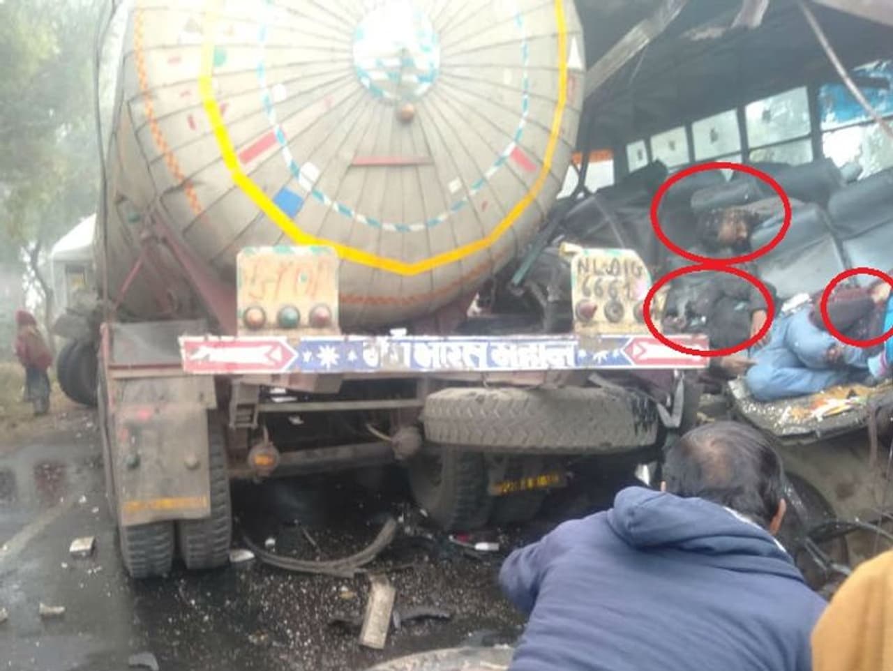 संभल ( Uttar Pradesh) । कोहरे और रफ्तार अधिक होने के कारण आज आगरा-मुरादाबाद राष्ट्रीय राजमार्ग पर दिल दहला देने वाला हादसा हुआ। इस हादसे को जिसने भी देखा उसका कलेजा दहल सा गया। क्योंकि बस को गैस टैंकर चीरता हुआ गया और यात्रियों के शव बस के अंदर पड़े थे, जबकि कुछ पहिए के नीचे दबे हुए थे। इस दौरान चीत्कार देखकर लोगों का दिल बैठा गया था। बता दें कि यह घटना धनारी थाना क्षेत्र के मानकपुर मढैया के पास आज सुबह सवा दस बजे के करीब हुआ।