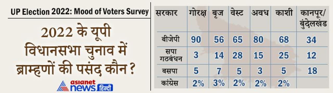 यूपी विधानसभा चुनाव में इस बार ब्राह्मण मतदाताओं में 70 प्रतिशत का झुकाव बीजेपी की तरफ दिख रहा है। जबकि 20 प्रतिशत ब्राह्मण मतदाताओं का झुकाव समाजवादी पार्टी गठबंधन की ओर है। वहां 10 प्रतिशत ने बसपा और 5 प्रतिशत ने कांग्रेस को अपनी पसंद बताया है।