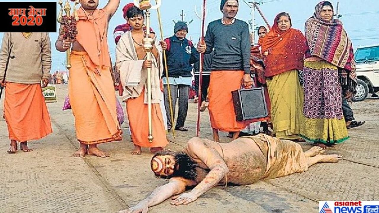माघ मेले में कल्पवास करने आए मौनी बाबा अपने शिविर से संगम स्नान करने रोजाना लेट कर जाते हैं।