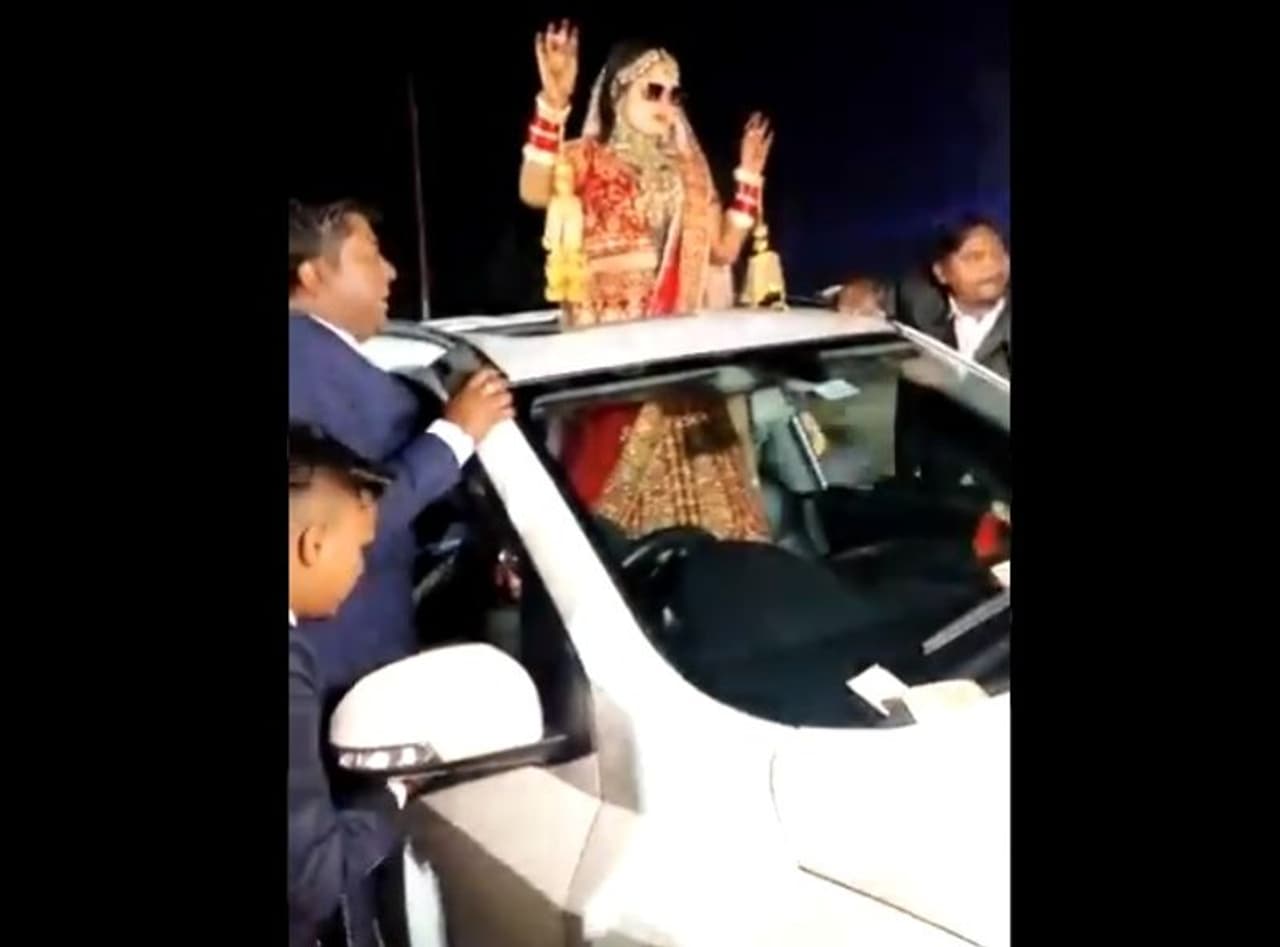 सिंचाई विभाग के कर्मचारी अंशुल की बारात सिखेड़ा थाना क्षेत्र के गांव बहादरपुर से शेरनगर गांव में गई थी। मंगलवार की रात दु्ल्हन कार के सनरूफ में खड़ी होकर बारातियों संग डांस कर रही थी।