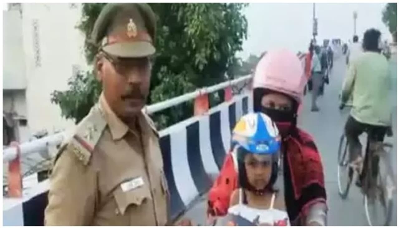 यूपी के देवरिया की एक बच्ची और उसकी मां का एक विडियो वायरल हुआ है। विडियो में ट्रैफिक नियमों का पालन करते हुए दोनों ने हेल्मेट लगा रखा है और इसके लिए एक पुलिस अधिकारी उनकी तारीफ करता दिख रहा है।
