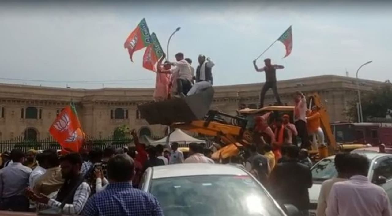 आधा दर्जन से अधिक लोग जेसीबी के बकेट में सवार होकर भाजपा का झंडा लहरा रहे थे। जेसीबी की छत पर भी पार्टी के झंडे के साथ एक कार्यकर्ता चढ़कर अपनी खुशी व्यक्त कर रहा था। इस दौरान सैकड़ों की संख्या में कार्यकर्ता विधानसभा के बाहर जश्न मनाते और जयकारे लगाते दिखे।