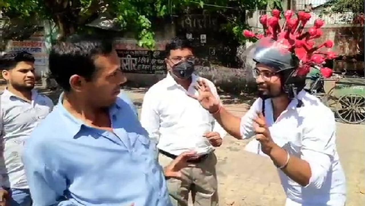 मुरादाबाद (Uttar Pradesh)। कोरोना वायरस के बढ़ते मामलों को लेकर लोग परेशान हैं। इससे लड़ने के लिए प्रधानमंत्री नरेंद्र मोदी ने पूरे देश में 14 अप्रैल तक के लिए लॉकडाउन लागू कर दिया है। इसी बीच मुरादाबाद से कुछ तस्वीरें भी सोशल मीडिया पर खूब वायरल हो रही हैं। इस तस्वीर में एक शख्स सड़कों पर निकलने वालों से अनोखे तरीके से अपील कर रहा हैं। इसके लिए उसने खुद के सिर पर कोरोना वायरस-थीम वाला हेलमेट पहन रखा है और सड़क से गुजरने वालों रोक कर उन्हें जागरुक कर रहा है। पड़ताल में ये तस्वीर मुरादाबाद के सामाजिक कार्यकर्ता विश्वेश पाल की निकलीं, जो लोगों से अनोखे अंदाज में समझाने का प्रयास कर रहे थे।