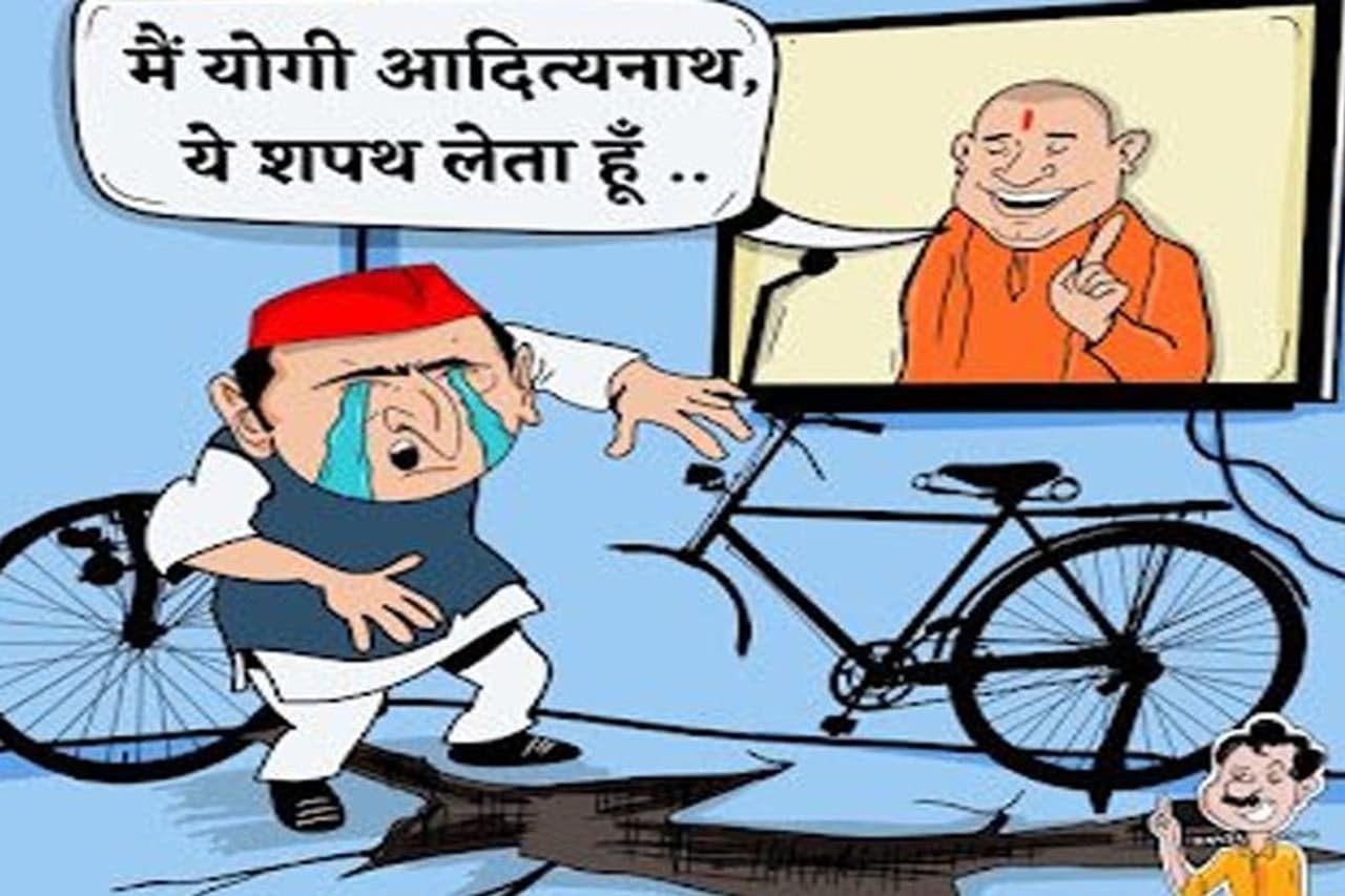 एक यूजर्स ने कार्टून शेयर करते हुए लिखा मैं योगी आदित्यनाथ शपथ लेता हूं। वहीं, यूजर्स ने अखिलेश यादव की फोटो भी शेयर की है।