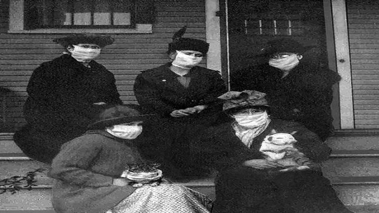 1918 में अमेरिका में फैली स्पेनिस फ्लू की महामारी के दौरान अपने घर के बाहर मास्क लगा कर बैठी कुछ महिलाएं। दो महिलाओं ने अपने पेट्स को भी मास्क पहना कर उन्हें गोद में ले रखा है।