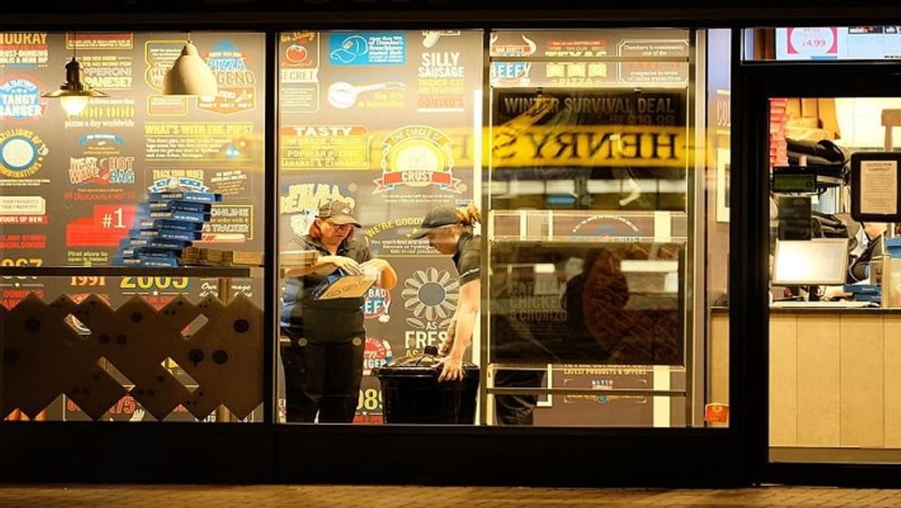 फोल्कस्टोन के इस डोमिनॉज पिज्जा स्टोर में वर्कर एक-दूसरे के काफी करीब नजर आ रहे हैं। जाहिर है, वे सोशल डिस्टेंसिंग के रूल को फॉलो नहीं कर रहे हैं।