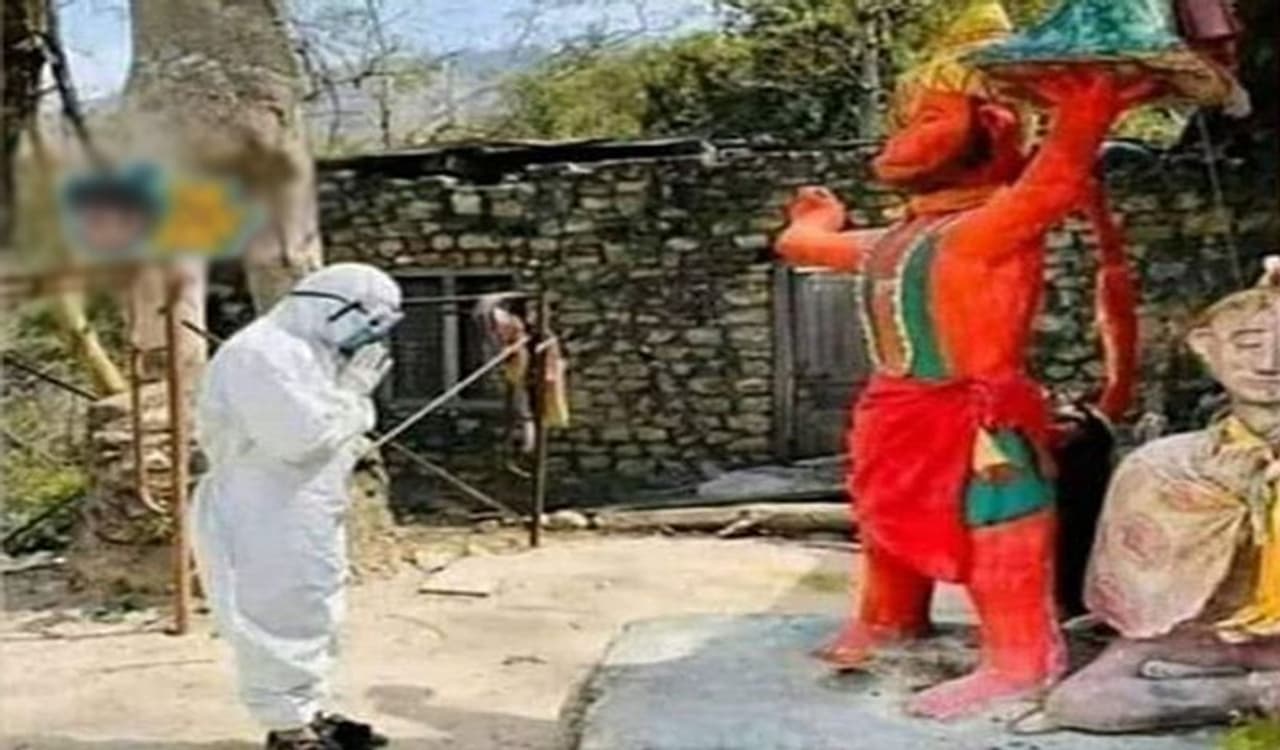 सोशल मीडिया पर ये तस्वीर तेजी से वायरल हो रही है। इस तस्वीर में एक कोरोना वॉरियर हनुमानजी की मूर्ति के सामने सिर झुकाया नजर आया। इस तस्वीर को सोशल मीडिया पर कई लोगों ने शेयर किया। हालांकि, ये तस्वीर किसने और कब ली, इसकी कोई जानकारी नहीं है। साथ ही कई लोगों ने इस तस्वीर को फेक भी बताया।