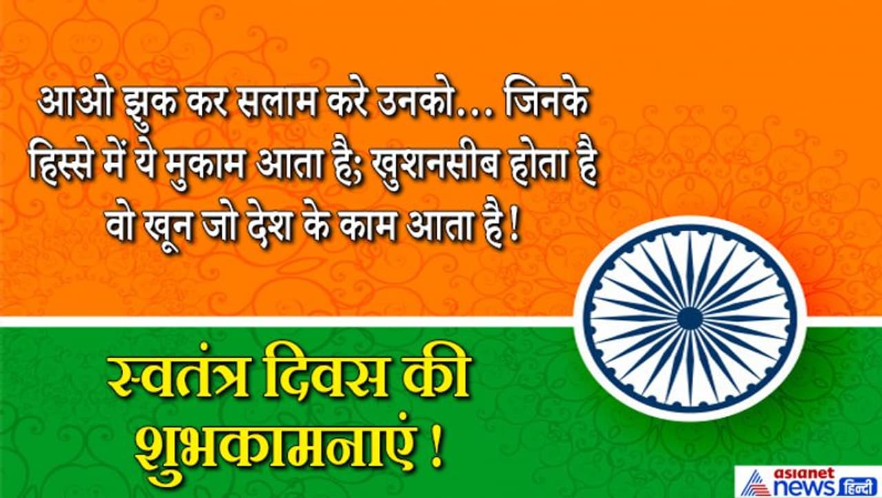 हटके डेस्क : देश अपनी 74वीं वर्षगांठ मना रहा हैं। इस बार कोरोना के चलते आजादी का पर्व जगह - जगह नहीं मनाया जा रहा पर आप स्वतंत्रता दिवस के मौके पर अपने दोस्तों और चाहने वालों को स्वतंत्रता दिवस के मैसेज, कोट्स, शायरी, स्टेटस, इमेज भेंज सकते हैं। हम आपके लिए लेकर आए हैं स्वतंत्रता दिवस की बेस्ट शायरी, जिन्हे आप इंडिपेंडेंस डे पर अपने दोस्तों के साथ शेयर कर हैप्पी इंडिपेंडेंस डे विश कर सकते है।