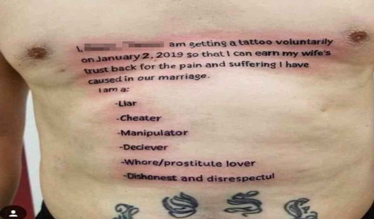 शख्स ने 2 जनवरी 2019 को अपनी पत्नी को दूसरी लड़की के साथ धोखा दिया। लेकिन माफ़ी मांगने के लिए उसने अपनी धोखे की बात को टैटू में लिखवाया। इसमें उसने खुद को धोखेबाज और झूठा बताया।