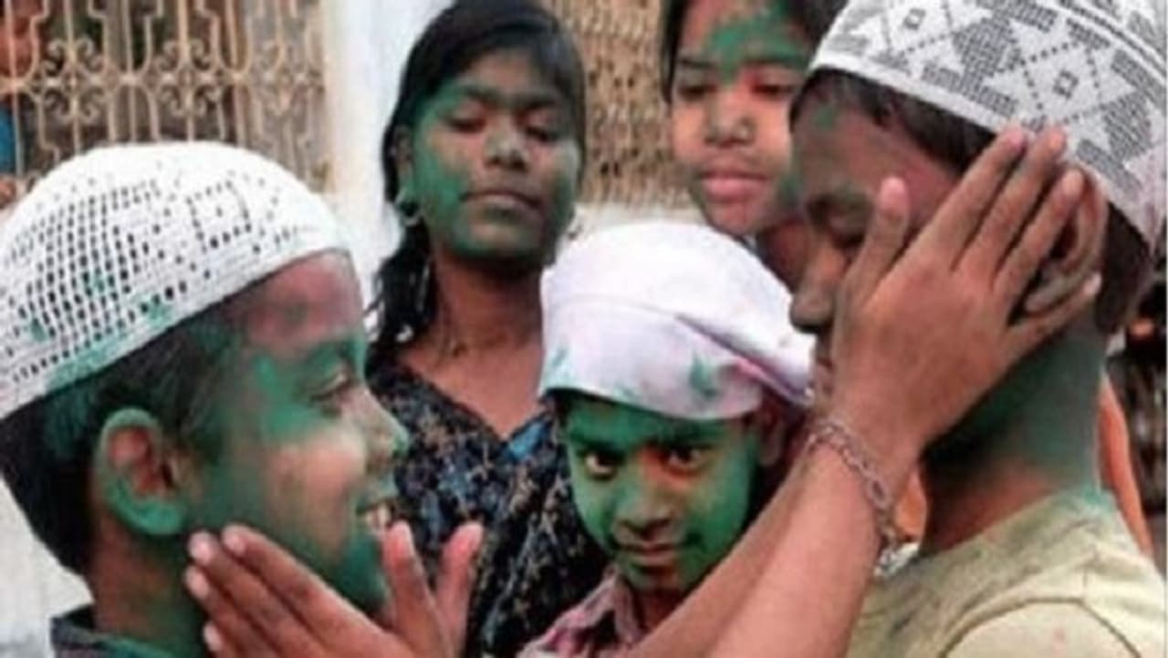 इस्लामी टोपी पहने छोटे-छोटे बच्चे एक-दूसरे को रंग और गुलाल लगा कर होला का त्योहार मनाते हैं।