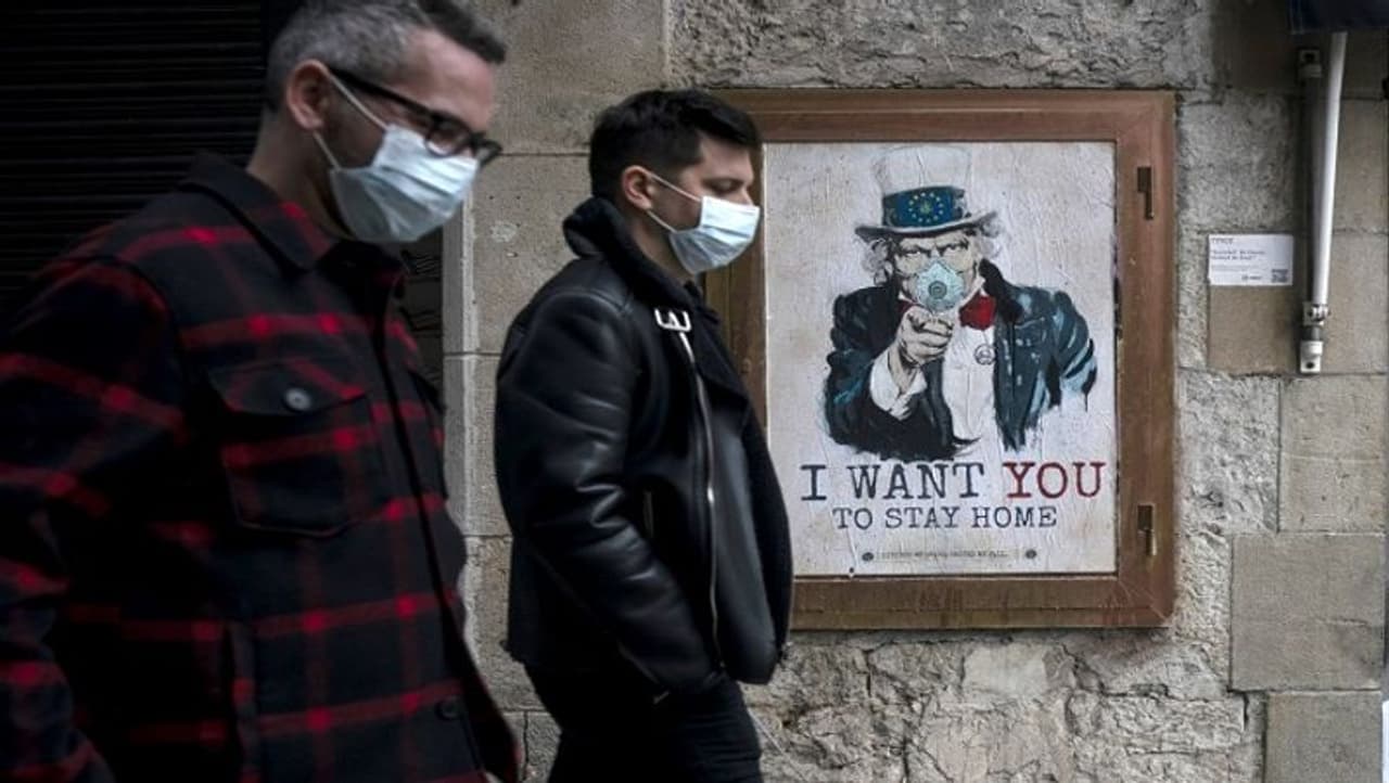स्पेन के बार्सिलोना में एक आर्टिस्ट द्वारा बनाई गई तस्वीर के पास से मास्क लगाए गुजरते लोग। तस्वीर में लिखा गया है कि अपने घर में रहें।