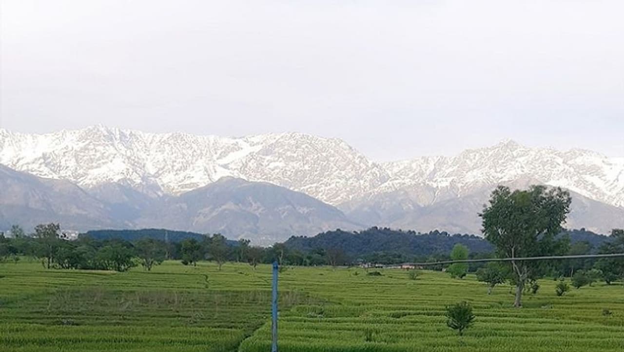 हिमालय की बर्फीली चोटियों के साथ वहां से कुछ दूर फैली हरियाली भी दिखाई दे रही है।