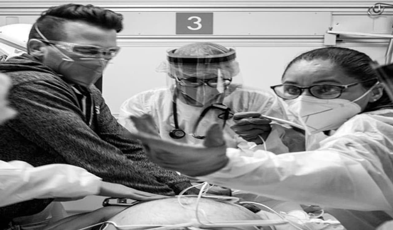 कोविड 19 के एक मरते मरीज को बचाने की हर संभव कोशिश में लगे तीन डॉक्टर। नर्स डोरिस रोल्डन (राइट) एपिनेफ्रीन की खुराक मरीज को देती हुई। जबकि नर्स जेरेमी हिल सीपीआर करती हुई और डॉ रूबेन गुज़मैन उसकी सांस जांचते हुए नजर आ रहे हैं।