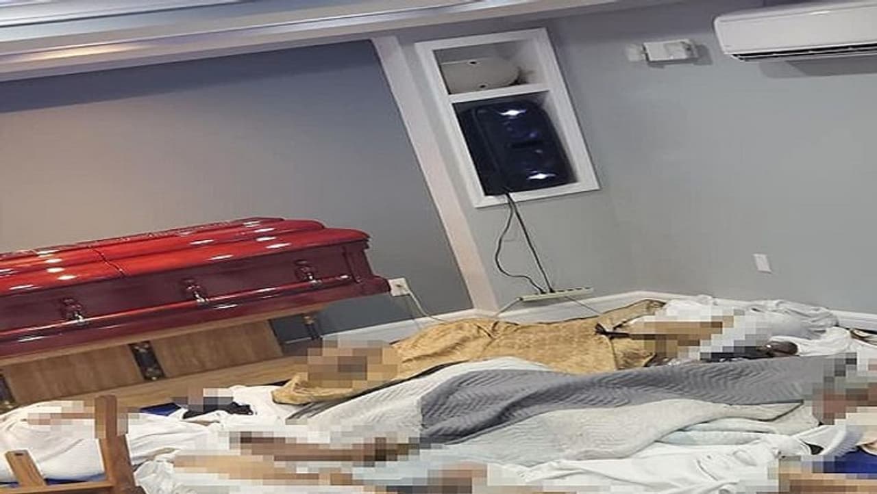 ब्रूकलिन के एंड्रयु क्लेक्ली फ्यूनरल होम के अंदर लाशें एक के ऊपर एक रखी हुई हैं।