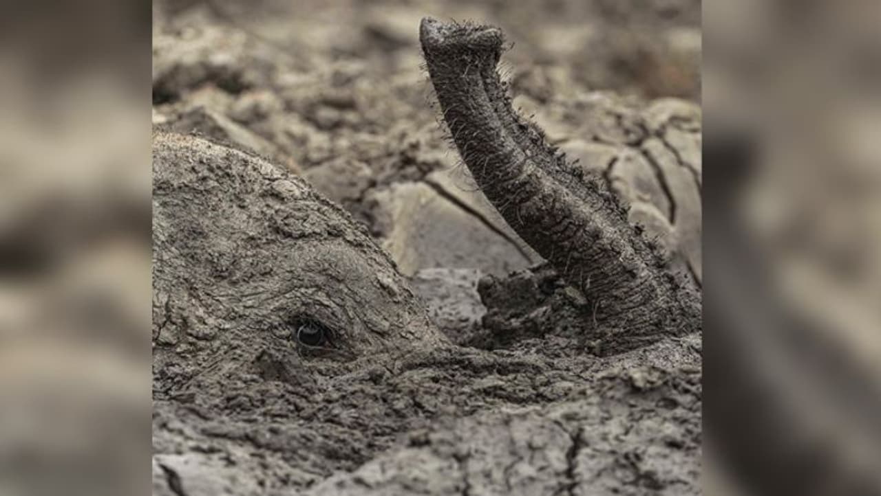 इन तस्वीरों में अपने बच्चे के साथ दलदल पार करती हथिनी नजर आ रही है।