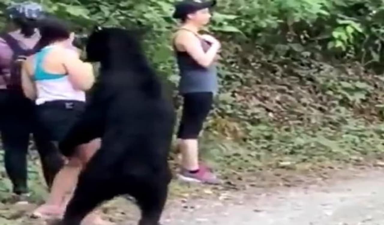 भालू ने ना सिर्फ महिला को पीछे से पकड़ा बल्कि उसके पैर में छिपकर उसे सूंघा। आमतौर पर भालू इतने फ्रेंडली नहीं होते।
