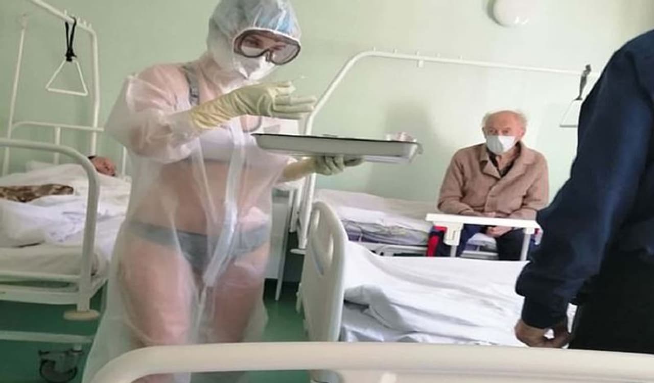 बताया जा रहा है कि ये नर्स मास्को के तुला के एक अस्पताल की है। यहां एक अस्पताल में नर्स मर्दों के वार्ड में जैसे ही घुसी, सारे मरीज उसे घूरकर देखने लगे। नर्स ने अंदर बिकिनी और बाहर से ट्रांसपेरेंट पीपीई किट पहनी थी।
