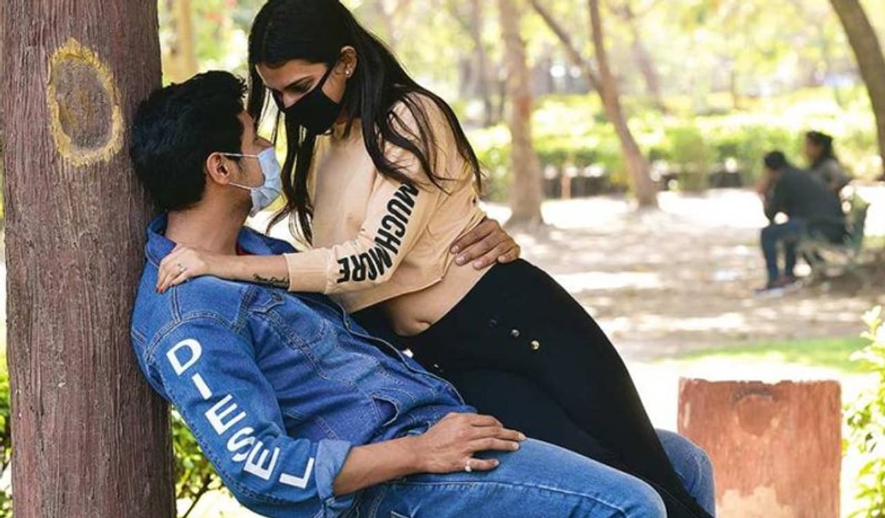 कोरोना की शुरुआत में लोग घर से बाहर निकल रहे थे। सभी नॉर्मल लाइफ जी रहे थे। एक कपल पार्क में मास्क लगाकर रोमांस करता हुआ।