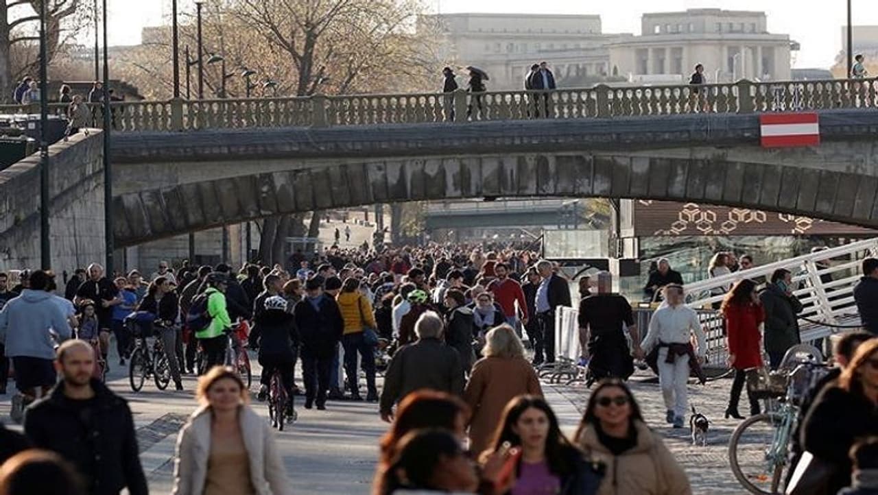 कोरोना वायरस फैलने के बावजूद पेरिस में सीन नदी के किनारे मौज-मस्ती करते लोग।