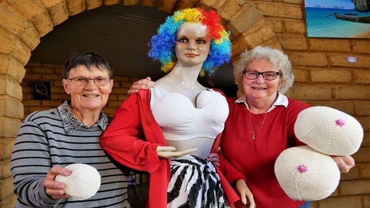 ब्रेस्ट कैंसर से पीड़ित रही महिलाओं के लिए बनाई जाने वाली वुलेन ब्रा को दिखाते हुए दो बुजुर्ग वॉलन्टियर।