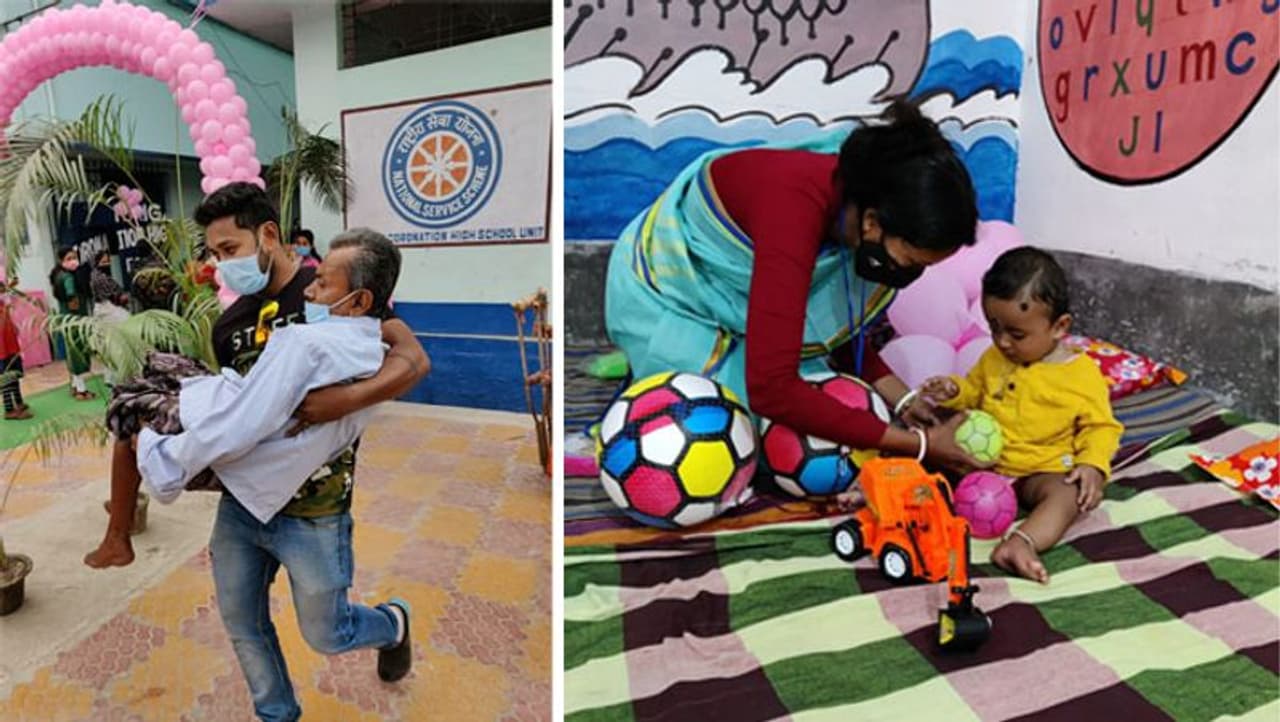 दिव्यांग मतदाता को वोट डलवाने ले जाता उसका परिजन। पोलिंग बूथ पर ड्यूटी करने वाली महिला कर्मचारियों और मतदाताओं के बच्चों के खेलने का इंतजाम भी किया गया था।