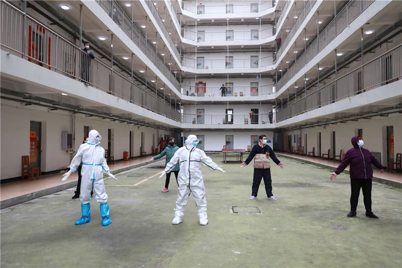 वुहान में बुरी तरह से फैले कोरोना वायरस से निपटने के लिए यहां 16 अस्थाई अस्पताल खोले गए थे। 1 मार्च को पहले अस्थाई अस्पताल से सभी मरीजों को डिस्चार्ज किया गया था। (वुहान में एक सेंटर पर मरीजों को एक्सरसाइज कराता मेडिकल स्टाफ) )