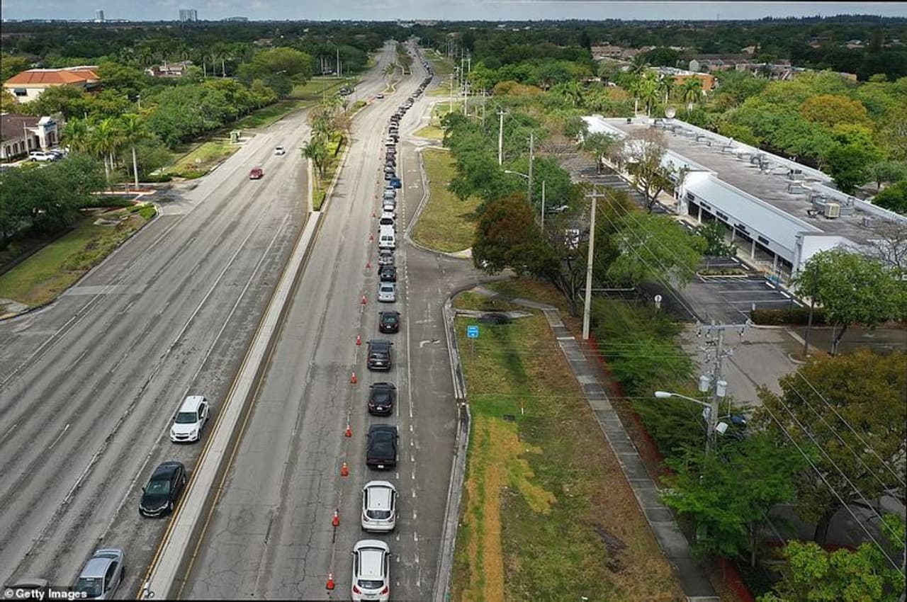 अमेरिका में लॉकडाउन के बाद से फूड बैंकों के बाहर इंतजार कर रही कारों की लंबी लाइनें दिखना आम हो गया है। यह अमेरिका के फ्लोरिडा और पेन्सिलवेनिया में भी आम नजारे हो गए हैं।