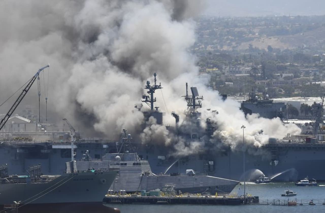 लॉस एंजेलिस . कैलिफोर्निया में स्थित नेवल बेस सैन डिएगो में अमेरिकी नौसेना के जहाज में धमाके के बाद आग लग गई। आग की चपेट में आकर 21 लोग जख्मी हो गए। बताया जा रहा है कि युद्धपोत में तब धमाका हुआ, जब इसे सैन डिएगो में मेनटिनेंस के लिए लाया गया था। धमाके के बाद यूएसएस बोनहोमे रिचर्ड जहाज में आग लग गई। इसके चलते पूरे सैन डिएगो पर धुएं का गुबार छा गया। तस्वीरों में देखें कितना भयानक था हादसा...