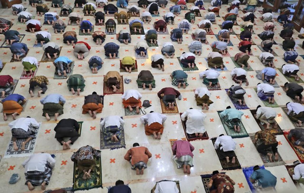 इंडोनेशिया में सोशल डिस्टेंसिंग के साथ ईद मनाई गई। यहां मस्जिद में पहले से ही लोगों को दूर दूर बैठकर नमाज पढ़ने के लिए कहा गया।