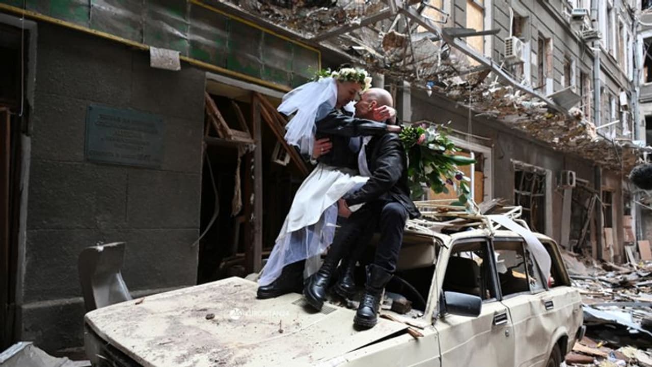 शादी के बादी फोटो खिंचवाते अनास्तासिया ग्राचोवा(Nurse Anastasiya Grachova) और उनके साथी एंटन सोकोलोव( Anton Sokolov)। बता दें कि यूक्रेन के  कीव शहर सहित लगभग हर क्षेत्र में हवाई हमले की चेतावनी जारी की गई है। चेर्कासी, चेर्नित्सि, निप्रॉपेट्रोस, डोनेट्स्क, इवानो-फ्रैंकिव्स्क, खार्किव, खमेलनित्सकी, किरोवोह्रद, कीव, ल्विव, मायकोलाइव, ओडेसा, पोल्टावा, रिव्ने, सुमी, टेरनोपिल, विन्नित्सिया, वोलिन, ज़कारपट्टिया और ज़ापोरिज़बलास्त्या में सायरन सक्रिय किए गए हैं।