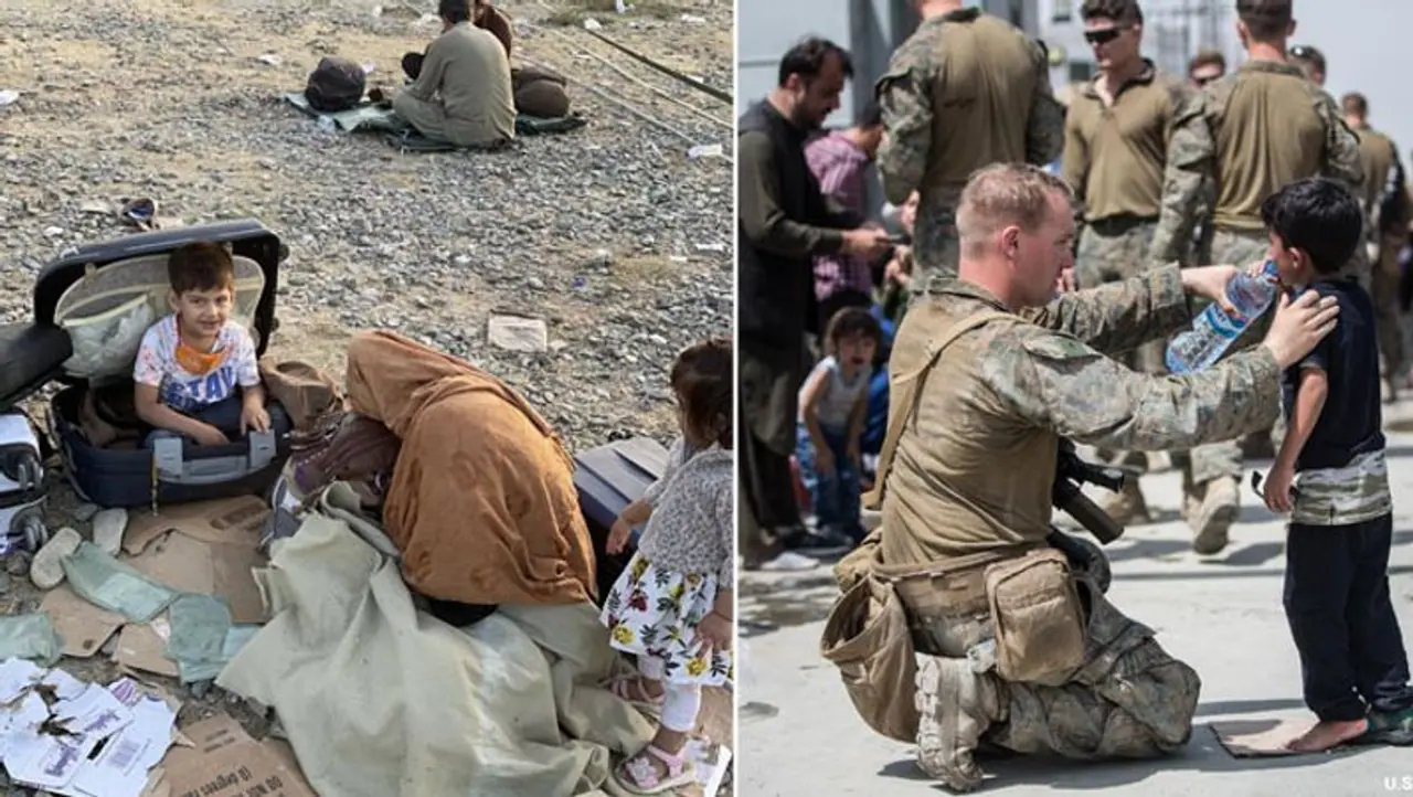इस तस्वीर में आप देख सकते हैं कि यूएस मरीन (United States Marine Corps) का एक जवान काबुल हवाई अड्डे पर देश छोड़कर जाते एक परिवार के बच्चे को पानी पिलाते हुए।