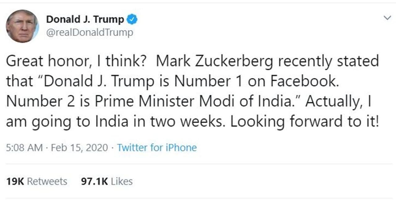 दरअसल, ट्रम्प ने शनिवार को एक ट्वीट किया। इसमें उन्होंने लिखा, मुझे लगता है कि यह सम्मान की बात है। मार्क जकरबर्ग ने हाल ही में कहा था कि डोनाल्ड ट्रम्प नंबर एक पर हैं। वहीं, पीएम मोदी नंबर दो पर हैं। मैं अगले दो हफ्ते बाद भारत जा रहा हूं। इस बारे में देख रहा हूं।