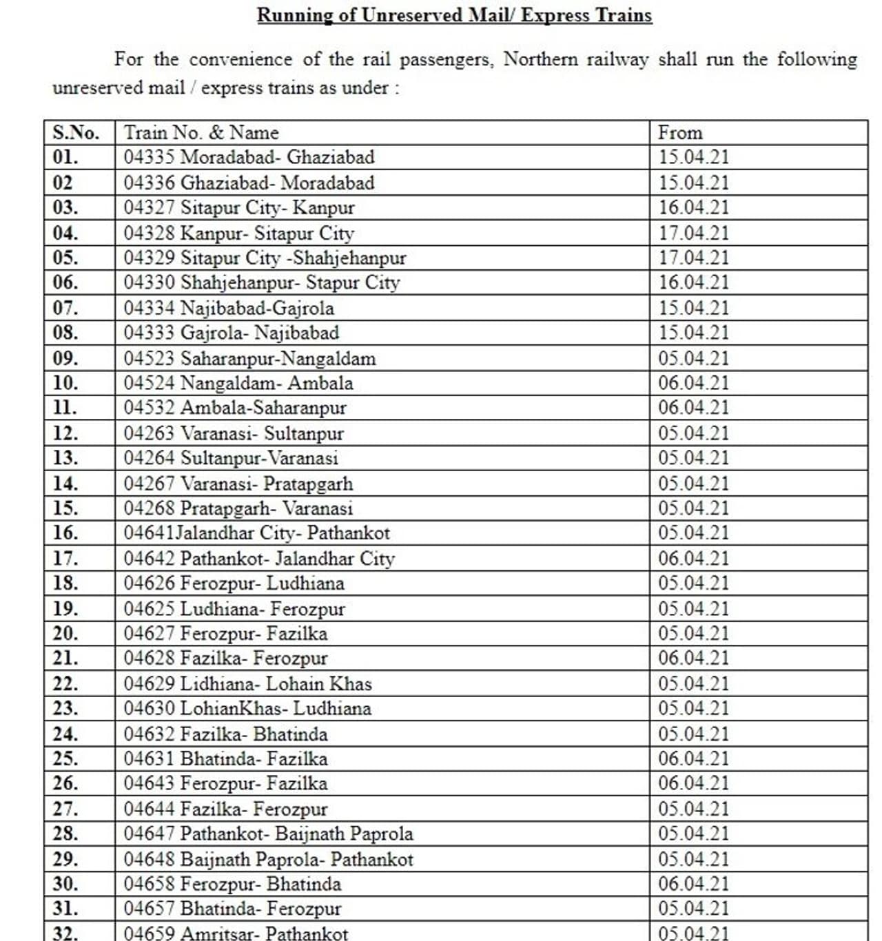 रेलवे के मुताबिक, सहारनपुर-दिल्ली जंक्शन, फिरोजपुर कैंट-लुधियाना, फजिल्का-लुधियाना, बठिंडा-लुधियाना, वाराणसी-प्रतापगढ़, सहारनपुर-नई दिल्ली, जाखल-दिल्ली जंक्शन, गाजियाबाद-पानीपत, शाहजहांपुर-सीतापुर, गाजियाबाद-मुरादाबाद समेत कई शहरों के लिए अनारक्षित ट्रेन चलेंगी। हालांकि इनके अलावा और भी कई रूट पर अनारक्षित ट्रेनें चलेंगी।