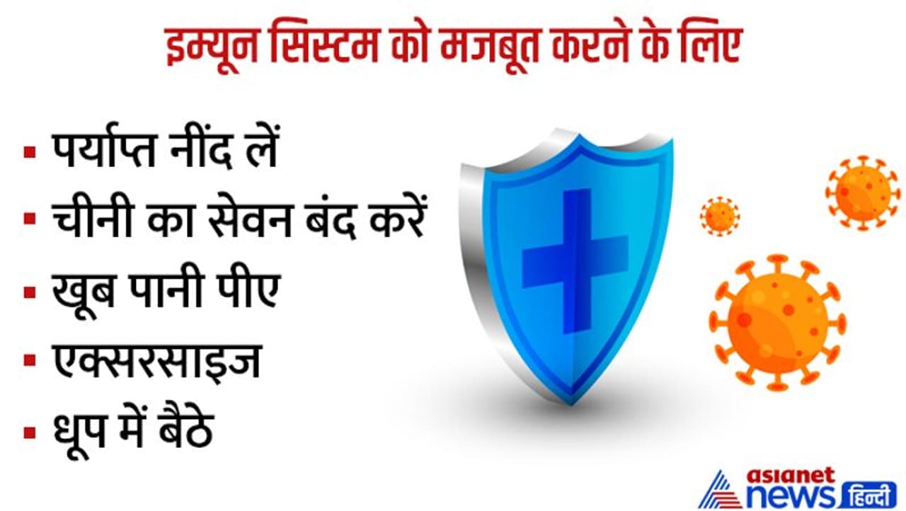 इसके अलावा पर्याप्त नींद, एक्सरसाइज करके भी अपने अंदर की ताकत को मजबूत कर सकते हैं। विटामिन डी की कमी आपके इम्यून सिस्टम को कमजोर कर सकती है। इसलिए जब भी वक्त मिले धूप में जरूर बैठें।