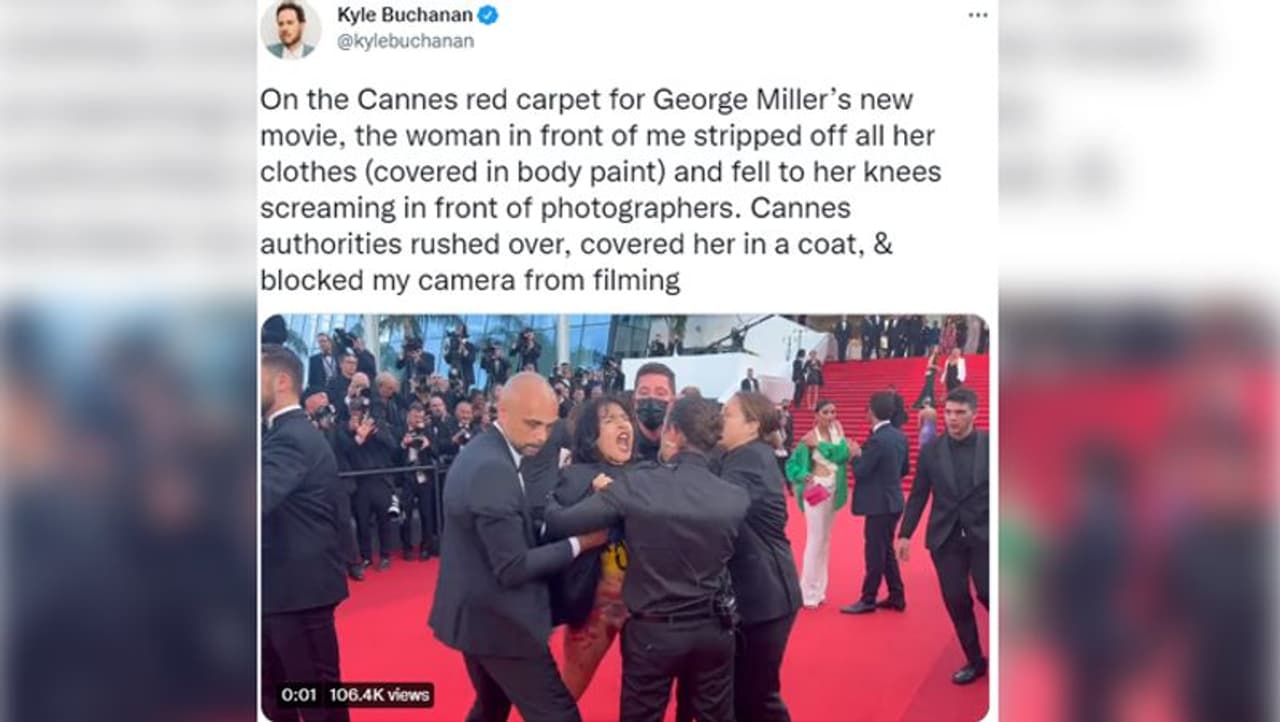अमेरिकी अखबार न्यूयॉर्क टाइम्स के रिपोर्टर काइल बुचानन ने सोशल मीडिया पर घटना का वीडियो शेयर किया है। उन्होंने लिखा है, "जॉर्ज मिलर की नई फिल्म के लिए कान्स के रेड कार्पेट पर था। मेरे सामने आकर एक महिला ने अपने सभी कपड़े उतार दिए (उसकी बॉडी पर पेंट था) और चिल्लाते हुए घुटनों के बल गिर गई। कान्स के अधिकारी मौके पर पहुंचे और उसके शरीर को कोट से ढंकते हुए मुझे रिकॉर्डिंग करने से रोक दिया।"