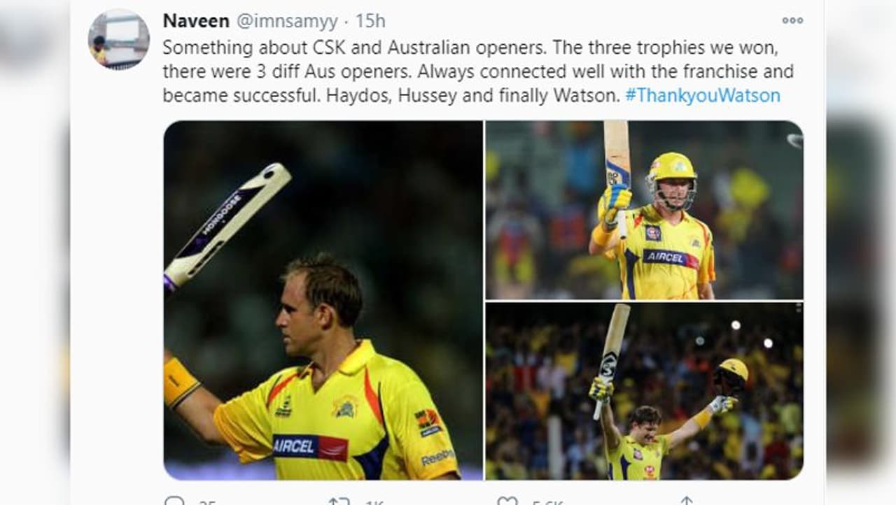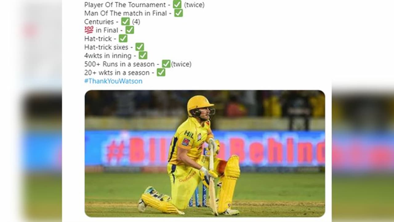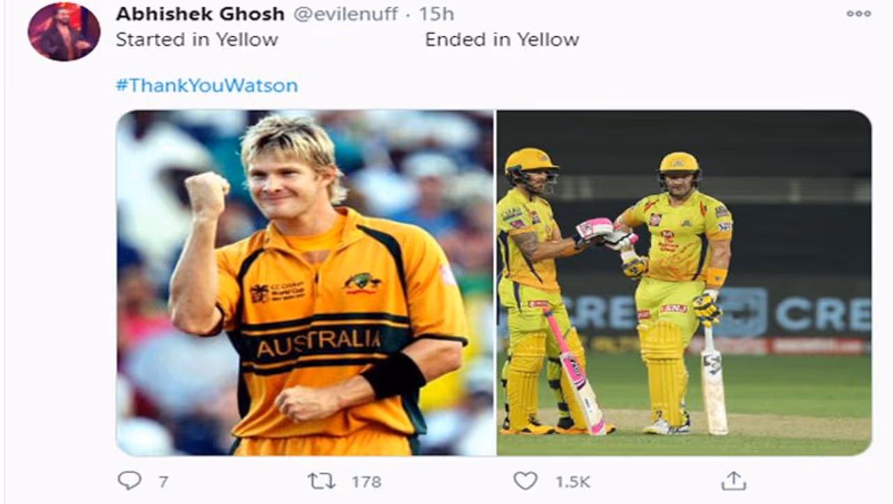 शेन वॉटसन के आईपीएल रिटायरमेंट के बाद सोशल मीडिया पर कई लोगों ने उनके लिए पोस्ट किए। ट्विटर पर एक यूजर ने वॉटसन की आईपीएल की शुरुआत और अंत की फोटो शेयर की और लिखा कि 'खेल की शुरुआत भी येलो में और अंत भी यलो में'।