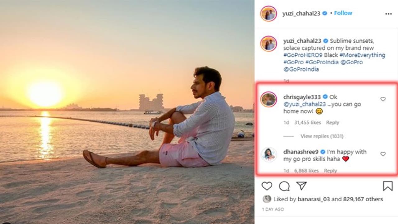 युजवेंद्र चहल की मंगेतर धनाश्री ने उनकी एक ऐसी तस्वीर खींची जिस पर युनिवर्सल बॉस क्रिस गेल ने भी कमेंट किया कि 'अब तुम घर जा सकते हो'। वहीं, उनकी मंगेतर ने लिखा कि 'आपके फोन से फोटो खींच कर मैं बहुत खुश हूं'।
