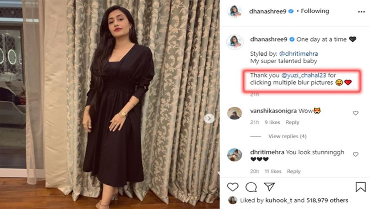 धनाश्री ने हाल ही में अपनी कुछ तस्वीरें इंस्टाग्राम पर शेयर की है। लेकिन उनकी फोटो क्लिक करने वाले युजी चहल को धनाश्री के गुस्से का भी शिकार होना पड़ा। दरअसल, इस तस्वीर को क्लिक करने के लिए चहल ने कई सारी ब्लर फोटो खींची, जिसके बाद धनाश्री को सिर्फ 1-2 अच्छी फोटो मिली।