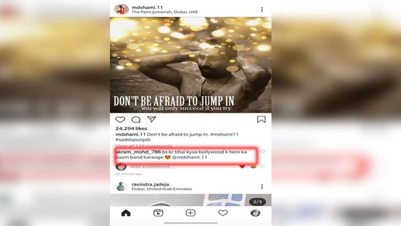 दुबई की चिलचिलाती गर्मी के बीच क्रिकेटर्स अपने आप को कूल रखने के लिए कभी पूल में तो कभी बीच पर चिल करते हुए नजर आ रहे हैं। हाल ही में किंग्स इलवेन पंजाब के बॉलर मोहम्मद शमी पूल में एंजॉय करते हुए दिखे। उन्होंने इंस्टाग्राम पर अपनी एक तस्वीर शेयर की है, जिसमें वह शर्टलेस होकर पूल के बीच में पोज दे रहे हैं। फोटो को पोस्ट करते हुए शमी ने लिखा कि 'पानी में कूदने से डरना नहीं चाहिए' (Don’t be afraid to jump in) उनकी इस तस्वीर को देखकर फैंस भी कह रहे हैं कि लगता है भाई बॉलीवुड एक्टर्स की नौकरी खाएगा। शमी की यह तस्वीर सोशल मीडिया पर जमकर वायरल हो रही है।