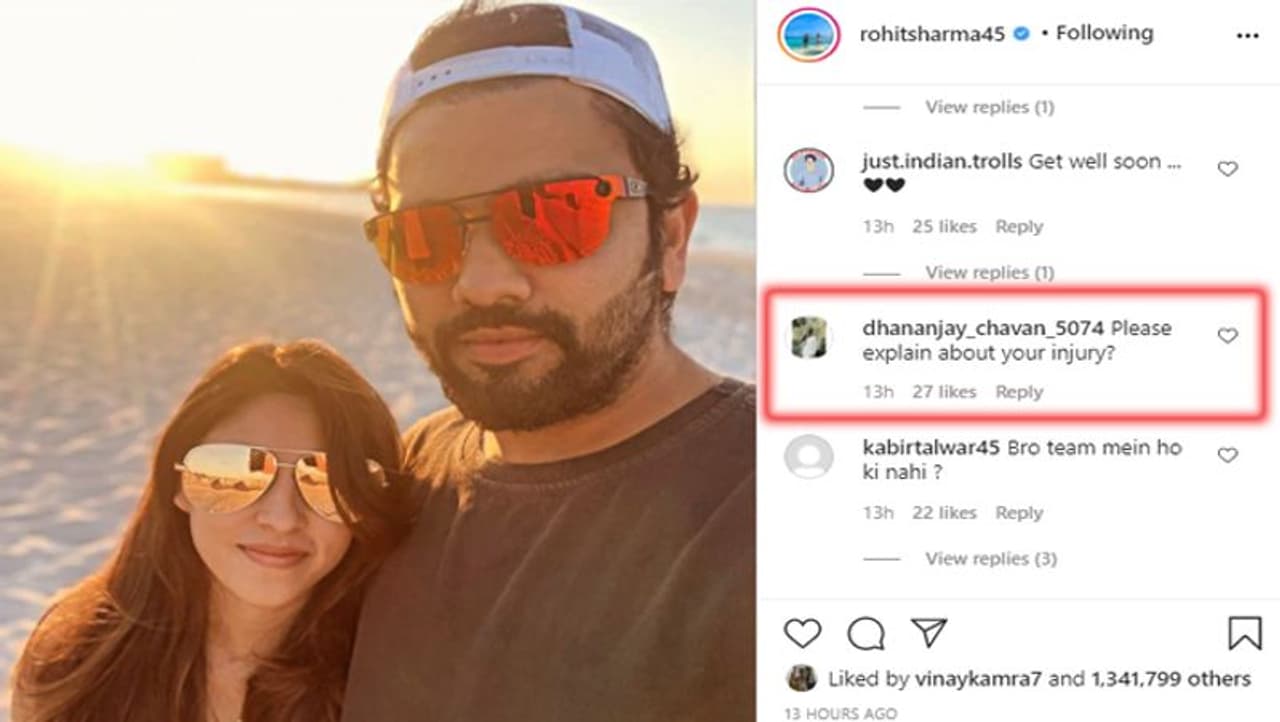 रोहित शर्मा की हैमस्ट्रिंग इंजरी की वजह से बीसीसीआई (BCCI) ने ऑस्ट्रेलिया दौरे के लिए रोहित शर्मा का किसी भी फॉर्मेट के लिए टीम में सिलेक्शन नहीं किया है। ऐसे में उनकी चोट को लेकर कई तरह के सवाल खड़े हो रहे है। हाल ही में रोहित शर्मा ने अपनी और रितिका की एक तस्वीर इंस्टाग्राम पर शेयर की है, जिसे देखकर फैंस कई तरह के सवाल पूछ रहे हैं। एक यूजर ने लिखा कि 'आप अपनी इंजरी के बारे में डिटेल से बताओ', तो कोई पूछ रहा है कि 'मैदान पर कब वापसी होगी'।