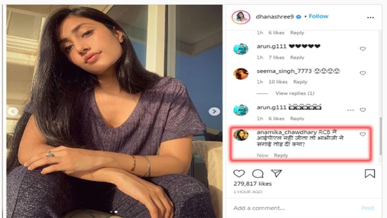 इस फोटो के साथ उन्होंने अपनी एक और फोटो शेयर की है, जिसे देखकर फैंस उन्हें जमकर ट्रोल कर रहे हैं और उनकी सगाई को लेकर ही सवाल करने लगे। दरअसल, इस तस्वीर में धनाश्री के हाथ में उनकी सगाई की अंगूठी नजर नहीं आ रही है, जिसपर एक यूजर ने कमेंट किया कि 'आरसीबी ने आईपीएल नहीं जीता तो भाभीजी ने सगाई तोड़ दी है क्या'?